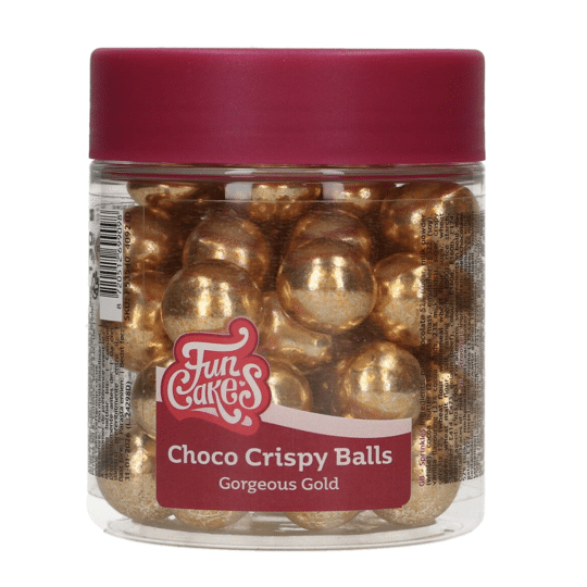 De FunCakes Choco Crispy Ballen behoren tot onze premium lijn strooisels, te herkennen aan het speciale potje met paarse deksel. Deze grote metallic gouden choco ballen (ø15 mm) hebben een heerlijke krokante kern, waardoor ze niet alleen de mooiste finishing touch voor je traktaties zijn, maar ook de lekkerste. De chocolade die gebruikt wordt voor deze ballen geeft je traktaties een luxueuze smaak en de trendy kleurencombinaties zorgen voor een elegante look. Ga je voor onze themacombinaties? Of gebruik je liever de effen kleuren om je eigen unieke ontwerp te maken? Onze premium sprinkle range geeft je eindeloos veel opties!