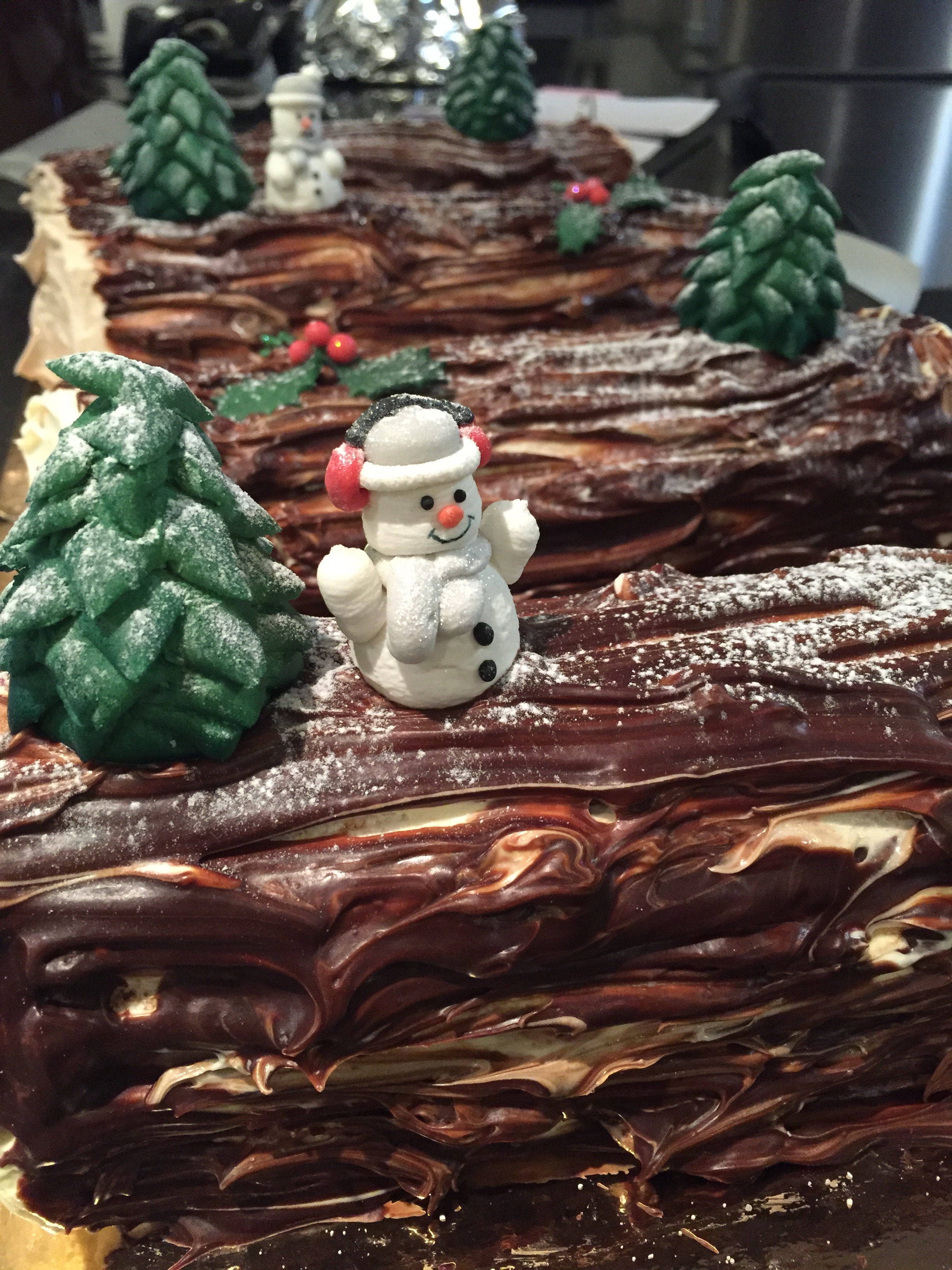 - als het chocolademengsel begint af te koelen, neem je de vork en strijk je de chocolade over de kerststronk.